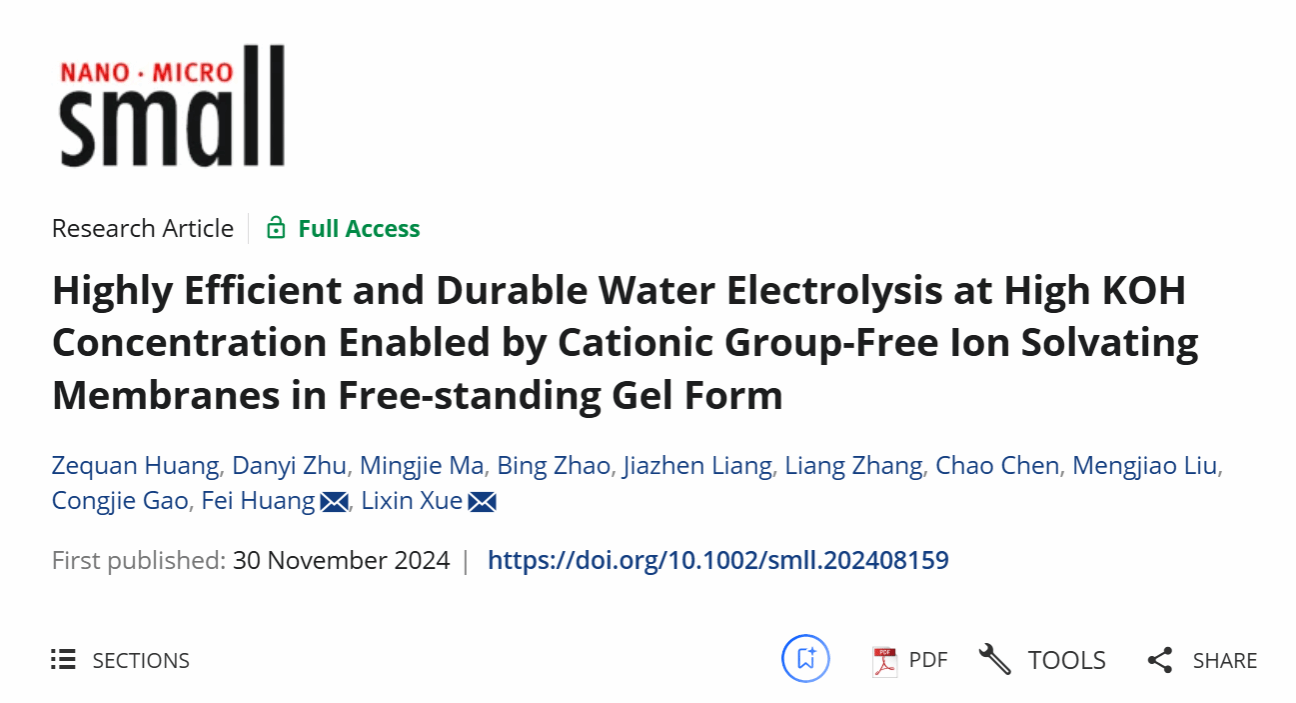 近日,我院薛立新研究员与浙江工业大学黄菲教授合作团队在国际知名的期刊 Small上发表题为“Highly Efficient and Durable Water Electrolysis at High KOH Concentration Enabled by Cationic Group-Free Ion Solvating Membranes in Free-standing Gel Form”的研究论文。该工作提出了一类新型的独立式凝胶形式的无阳离子基团的离子溶剂化膜 (ISM-PBI-FG) 用于高效和耐用的碱性水电解。该膜以凝胶形态存在,通过溶胶-凝胶转变过程后经KOH吸收制备而成。与传统的 AEM 和PBI基 ISM 相比,ISM-PBI-FG 膜具有多孔的内部结构和致密的外表面,为碱性电解质的吸收提供了更大的体积,并为离子传输创造了纳米级通道。ISM-PBI-FG膜是由纠缠的聚苯并咪唑(PBI)纳米纤维组成的3D多孔微观结构,实现了89%的孔隙率,使其能够吸收极高的碱液(在6 M KOH中为346%)并展现出卓越的离子传导性(在80°C时为763 mS cm⁻¹)。这一概念的可行性通过 AWE 测试得到了验证,其中使用 NiFe/Raney Ni(不含 PGM)和 NiFe/Pt/C (PGM) 催化剂组合,在 2.0V 下电流密度分别达 2.2 A cm-² 和 5.5 A cm-²,实现了优异的水电解性能。本研究工作得到国家自然科学基金委基金项目(22209147)和中国工程院院士咨询项目(2022-DZ-08)的资助完成。