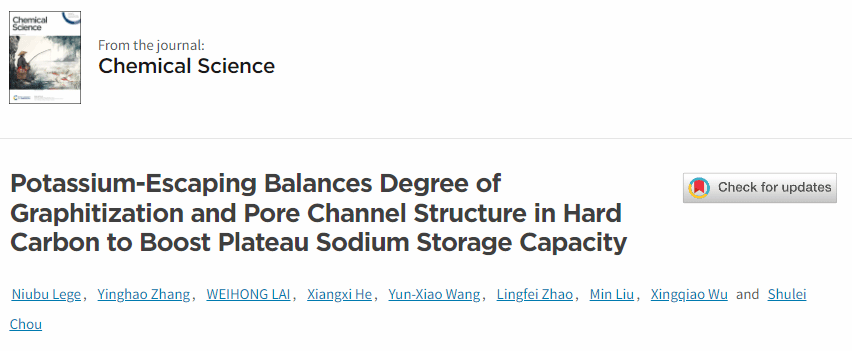 此项工作以Potassium-Escaping Balances Degree of Graphitization and Pore Channel Structure in Hard Carbon to Boost Plateau Sodium Storage Capacity为题发表在国际期刊Chemical Science上,温州大学作为第一单位,侴术雷教授,吴星樵老师为通讯作者。2021级联培研究生勒格牛布、化材学院2022级研究生张颖豪为共同第一作者,并得到课题组其他研究生和本科生协助。研究工作得到了国家自然科学基金,中国高端外国专家招聘计划,浙江省自然科学基金等项目支持。