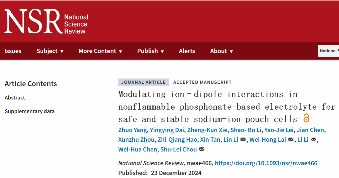 近日我校化材学院李林特聘教授团队联合复旦大学赖伟鸿研究员及上海大学李丽教授在国际权威期刊National Science Review上发表题为《Modulating Ion-Dipole Interactions in Nonflammable Phosphonate-Based Electrolyte for Safe and Stable Sodium-Ion Pouch Cells》的学术论文,这也是我校首次在该期刊上发表论文。在本研究中