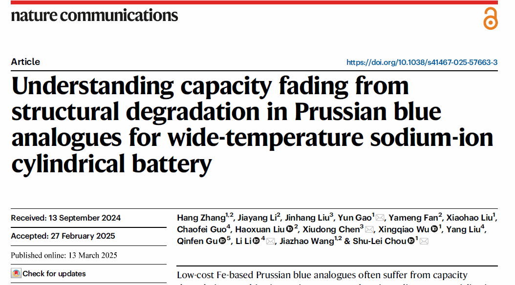 钠离子电池(SIBs)因钠资源储量丰富且成本低廉,在大规模储能领域展现出显著优势。近年来,SIBs正极材料的研究聚焦于层状氧化物、聚阴离子化合物及普鲁士蓝类似物(PBAs)三大体系。其中,PBAs因其高理论比容量(>150 mAh/g)、三维开放框架结构及低制备成本,在规模化应用中呈现独特潜力。然而,PBAs的实用化进程仍受限于循环过程中的容量衰减问题。研究表明,材料内部残留的结晶水会引发副反应(如产气)并破坏结构稳定性,而完全脱除结晶水又可能导致框架坍塌。尽管通过晶体结构优化、表面修饰及元素替代等手段可在一定程度上改善PBAs的稳定性,但其长循环性能仍难以满足储能系统的实际需求。因此,深入分析PBAs材料在循环过程中容量衰减的深层次原因,并对阵下药,提升材料结构的稳定性和循环稳定性至关重要。