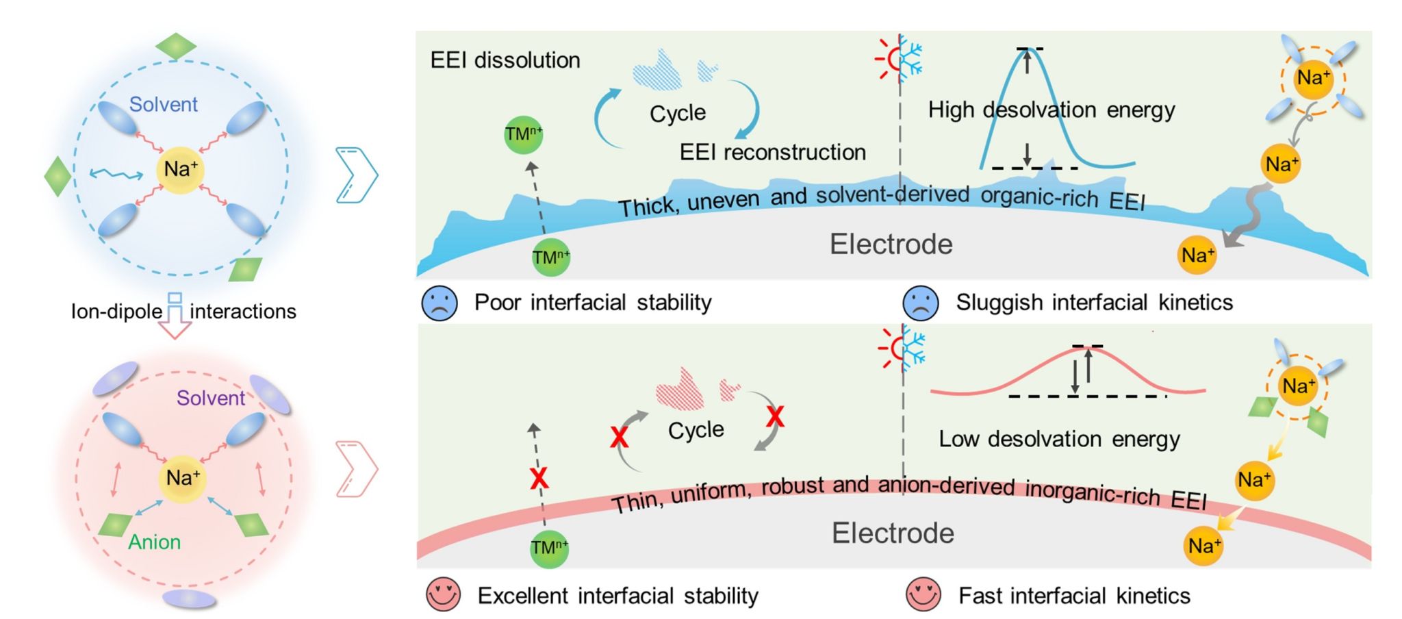 钠离子电池因钠资源丰富且成本低廉,被视为大规模储能系统的潜在候选者。然而,传统钠离子电池的温度耐受性较差,在极端温度条件下会出现容量快速衰减的问题,这严重阻碍了其实际应用。在较高的工作温度下,电极/电解液界面的溶解加剧,进而导致界面持续破坏与重构,同时伴随着电解液的不断分解;而不稳定的电极/电解液界面会引发过渡金属溶出,并增加热失控风险,最终导致钠离子电池的电化学性能恶化。另一方面,在较低的工作温度下,缓慢的界面动力学会限制电池的电化学性能。不仅如此,较高的动力学能垒会诱发钠沉积现象,这不仅带来严重的安全隐患,还会导致容量快速衰减。鉴于此,开发有效的策略以同时提升电极/电解液界面的稳定性和动力学性能,对于推动钠离子电池在极端温度条件下的应用具有重要的现实意义。