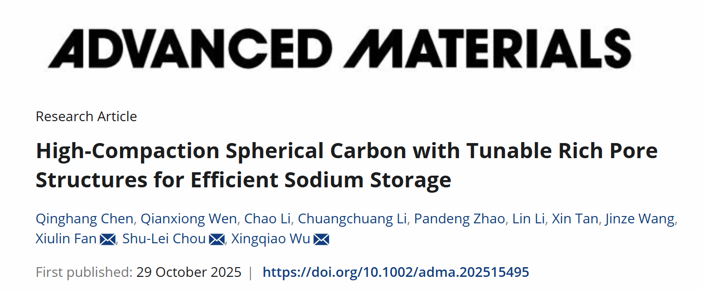 近日,我校化材学院吴星樵/侴术雷联合浙江大学范修林提出了一种硬碳负极的多尺度孔调控策略,有效解决了兼顾高比容量与高体积容量这一长期存在的难题。实验数据与理论计算表明,在水热过程中,乙酸改变了水热炭的疏水性,促进了分散性球形颗粒的形成,并提升了材料的压实密度。预孔工程策略可增加水热炭的自由体积与开放孔结构:其中,酯化反应形成的自由体积有利于最终硬碳中封闭孔结构的构建,而氧化刻蚀产生的开放孔则便于硬碳后续形成微孔结构。得益于对硬碳材料微观与介观尺度的双重调控,该材料展现出优异的电化学性能,其可逆容量达 375.40 mAh/g,首次库伦效率达 90.10%。当厚电极受到更高压实处理时,其球形形貌使其仍能保持较高的克容量(359.49 mAh/g),同时体积比容量得到提升(390.30 mAh/cm³)。与普鲁士蓝正极组装成扣式全电池时,电池能量密度高达 318.44 Wh/kg。值得注意的是,在宏观层面阐明了在低电位下,实验室规模与实际应用级电极中钠嵌入及孔填充过程背后的机制,为开发高能量密度钠离子电池提供了宝贵指导。该研究成果以" High-Compaction Spherical Carbon with Tunable Rich Pore Structures for Efficient Sodium Storage"为题,发表在国际顶级期刊《Advanced Materials》上。我校为第一通讯单位,第一作者是我校化材学院2025届硕士陈青杭。我校化材学院吴星樵博士、侴术雷教授、及浙江大学范修林教授为论文共同通讯作者。相关工作受到国家自然科学基金,浙江省自然科学基金等基金的资助。