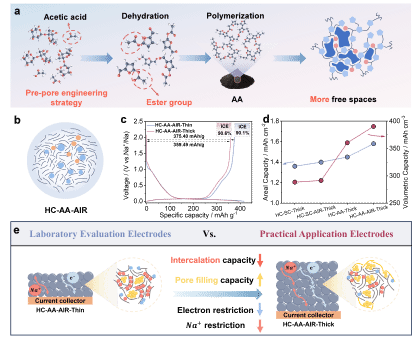 硬碳因其成本低廉、氧化还原电位适宜以及优异的储钠性能,已成为钠离子电池的首选负极材料。然而,尽管通过孔结构调控等策略能够提升可逆容量,但这些方法往往会导致材料压实密度的下降,从而限制体积能量密度并阻碍其大规模应用。因此,如何平衡孔结构优化与电极密度保持之间的协同关系,并深入探究其相互作用机制,对推动硬碳负极在实用化钠离子电池中的发展至关重要。