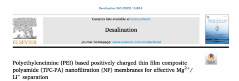 近日,温州大学/浙江工业大学研究员薛立新,发表于国际顶刊《Desalination》的论文 “Polyethyleneimine (PEI) based positively charged thin film composite polyamide (TFC-PA) nanofiltration (NF) membranes for effective Mg²⁺/Li⁺ separation” ,荣获该期刊颁发的 “2023-2025年度最佳论文奖” (“Best Paper in Desalination 2023–2025”)。