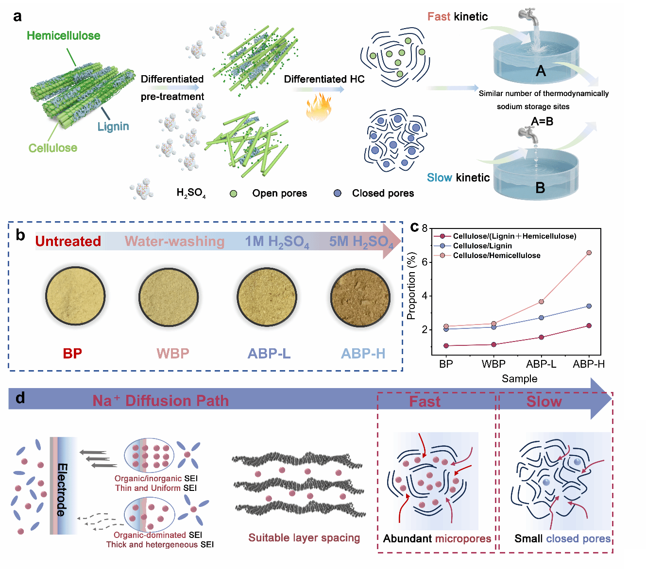 近日,我校化材学院吴星樵副研究员、侴术雷教授在国际权威期刊Advanced Energy Materials上发表题为《Unlocking Kinetic Limitations in Hard-Carbon Anodes to Enable Practical Fast-Charging Sodium-Ion Batteries》的研究型论文。他们提出了一种通过调控竹粉前驱体组分设计差异化孔结构的策略,以此研究硬碳材料的倍率失效机制。值得注意的是,采用上述差异化结构设计的硬碳表现出相似数量的热力学上可及的钠存储位点,但差异化明显的钠存储动力学行为。在2A g−1的电流密度下,ABP-L-1400的可逆容量为304.6 mAh g−1,是ABP-H-1400的1.24倍。系统的表征表明,动力学差异主要是由于低平台容量的变化,通过深入分析确定关键影响因素是均匀的有机/无机杂化固体电解质界面和微开孔结构。此外,实际应用还可以扩展到高功率普鲁士蓝//硬碳圆柱形电池,