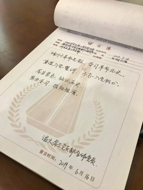 在深入开展“不忘初心、牢记使命”主题教育学习之际,为了更好的领会主题教育会议精神,牢牢把握守初心、担使命、找差距、抓落实的总要求,锤炼每一位同志忠诚干净担当的政治品格。2019年6月16日上午,化材学院研究生第三党支部开展了以“重温历史、不忘初心、牢记使命”为主题的党日活动,全体党员同志参观了位于温州市区江心屿的温州革命历史纪念馆和温州革命烈士纪念馆——浙江省爱国主义教育基地、党史文化教育基地。
