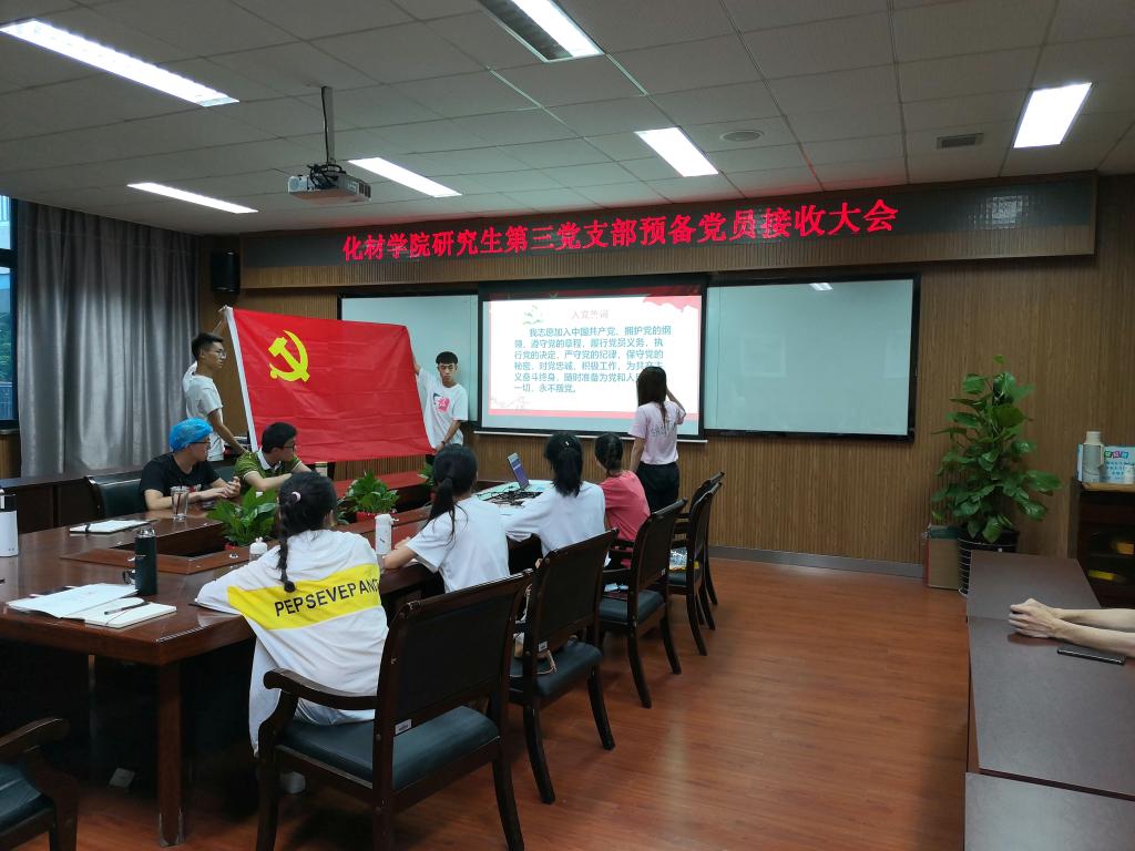 2019年6月10日下午18:00,化材学院研究生第三党支部在化材楼11B-204会议室召开了预备党员接收大会。本次大会,主要讨论接收汪晓敏同志为预备党员的问题。大会由支部书记贾雅君同志主持,化材学院研究生第三党支部全体党员参加了本次会议。