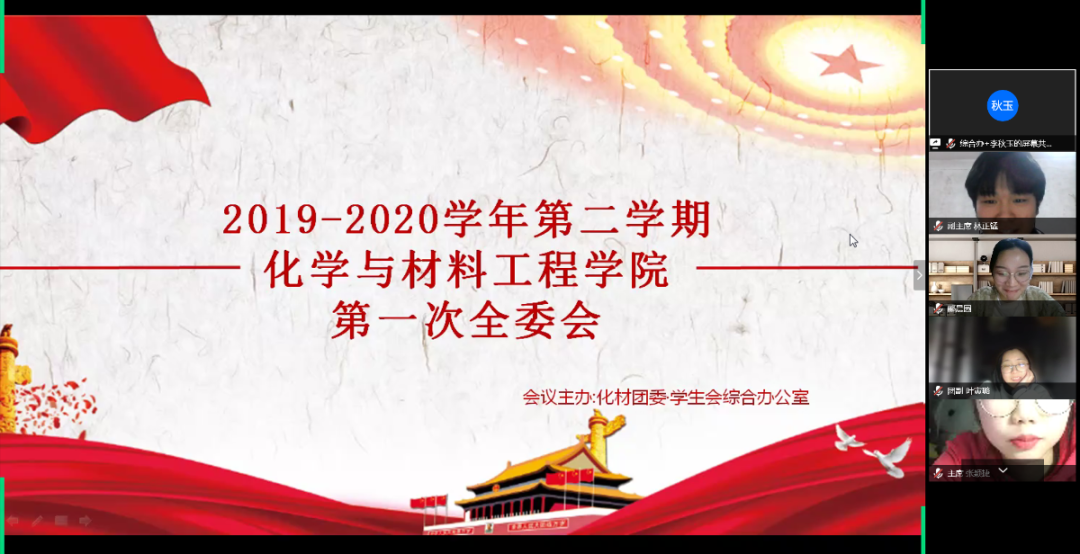 受此次疫情影响,我们化材团委·学生会于4月3日晚19:00召开线上会议。出席此次会议的有化材党委副书记周敬业老师、团委书记孙玮玮老师、学院辅导员邹涌彬和薛涛老师。另有团委学生会主席团成员、各中心主任及干事参与。