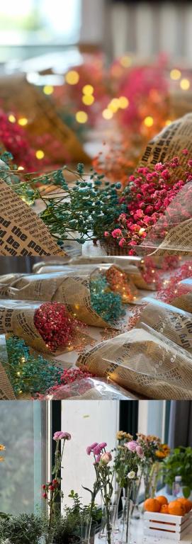 活动现场,花香奶香四溢,沁人心脾。首先进行的是花艺课,老师在讲解授课的过程中不时穿插互动环节,亲自示范了多种造型的插法,将融入大自然理念的插花艺术生动地展现在大家的面前。老师们则大胆发挥自己的想象力,通过自己灵巧的双手,将修剪和整枝的满天星、康乃馨等花材,根据不同的色彩、形状有层次地搭配在一起。置身于鲜花丛中的老师们兴致盎然,一束束融合了丰富想象力的插花作品展现在了大家的面前,每个人心中都充满了喜悦和成就感。