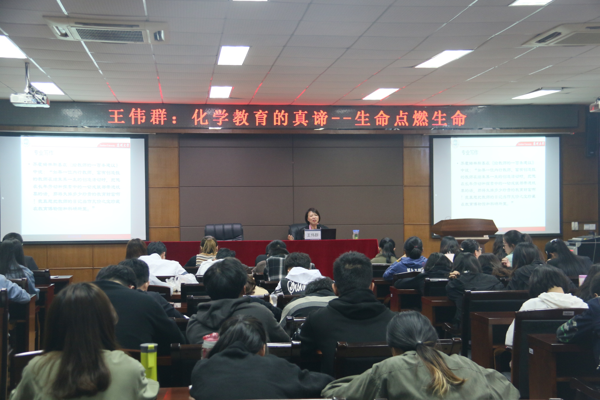 10月11日下午,化学与材料工程学院在化材楼11B-208会议室举办了第80期“责任·成长·成才”讲堂。我院82级校友、苏州大学材料与化学化工学部的王伟群教授给我院师范生带来了“化学教育的真谛——生命点燃生命”为主题的校友分享会。