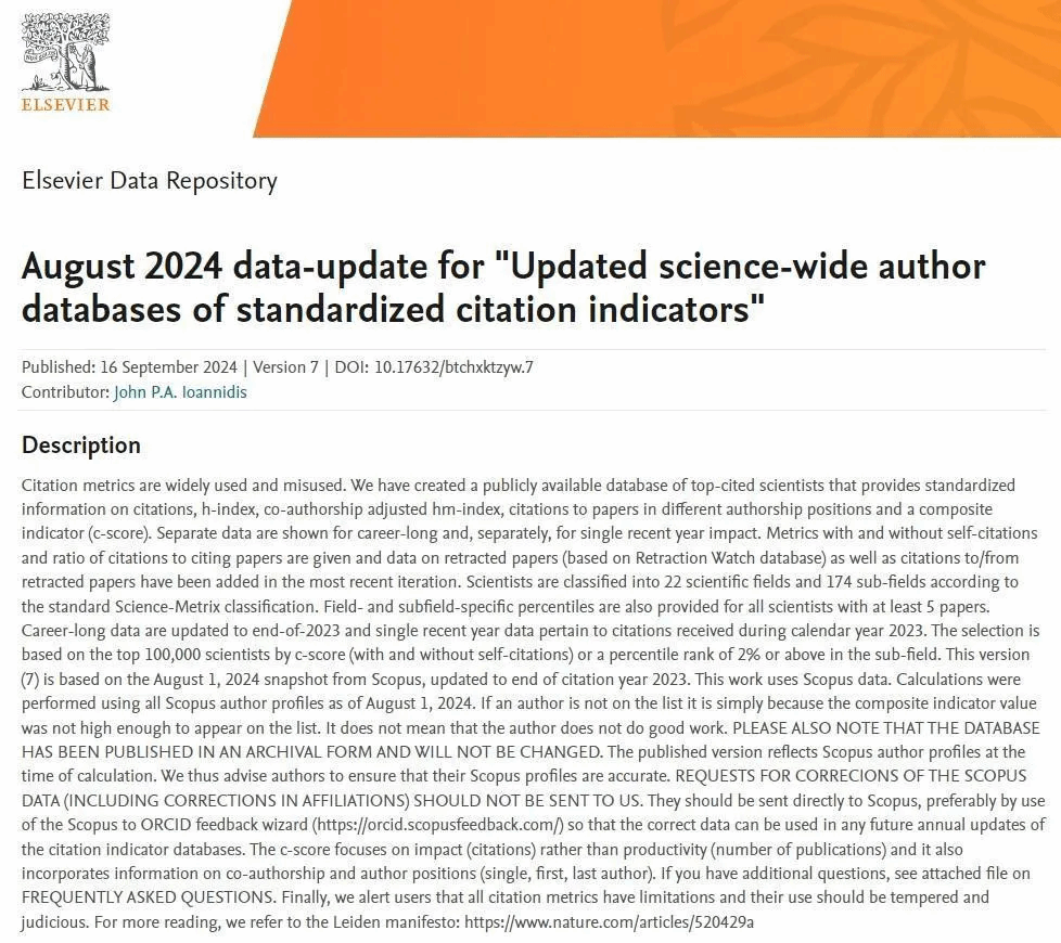 近日,美国斯坦福大学和Elsevier数据库发布了2024全球前2%顶尖科学家榜单(World's Top 2% Scientists 2024),并于Elsevier旗下Mendeley Data发布(2024 data-update for“Updated science-wide author databases of standardized citation indicators”)。人妻NTR