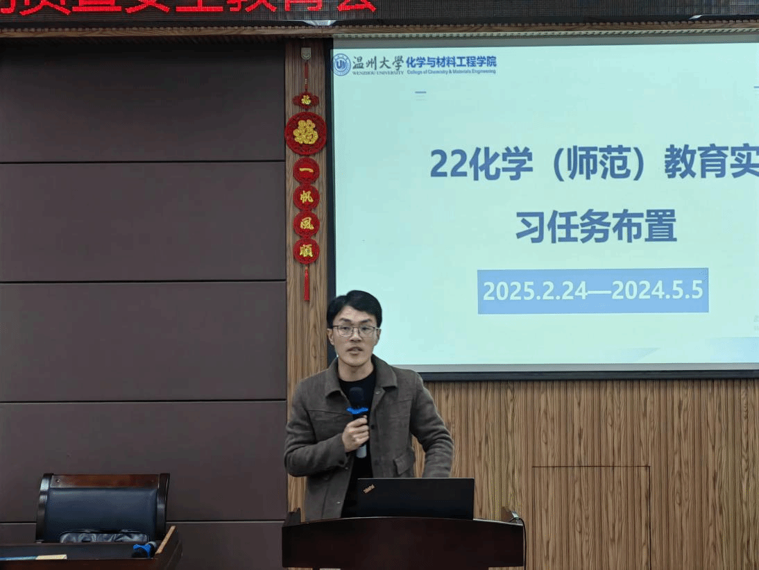 为深入贯彻落实新时代教师教育改革发展要求,扎实推进师范生教育实践工作规范化建设,全面提升师范生职业素养与育人能力,2025年3月3日,化材学院在11C-401教室召开2022级教育实习动员暨安全教育大会。副院长张礼杰、副书记王晓华、化学系主任方国勇以及陈迪妹、王嫁国、叶剑强等指导老师出席。会议由学工办主任邹涌彬主持。