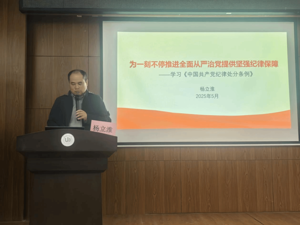 马克思主义学院党委书记、分党校校长杨立淮老师以《为一刻不停推进全面从严治党提供坚强纪律保障——学习〈中国共产党纪律处分条例〉》为主题开展专题讲座。在讲座中系统阐释全面从严治党的政治逻辑、历史经验与高校落实路径。他结合高校党建典型案例,剖析当前基层党建“最后一公里”痛点,提出以严实标准抓好“关键少数”、以品牌建设激活“神经末梢”、以数字赋能提升监督效能。鼓励学生党员把严的基调贯穿党建与业务融合全过程,以高质量党建引领高校事业高质量发展,让“红色引擎”持续释放强劲动能。