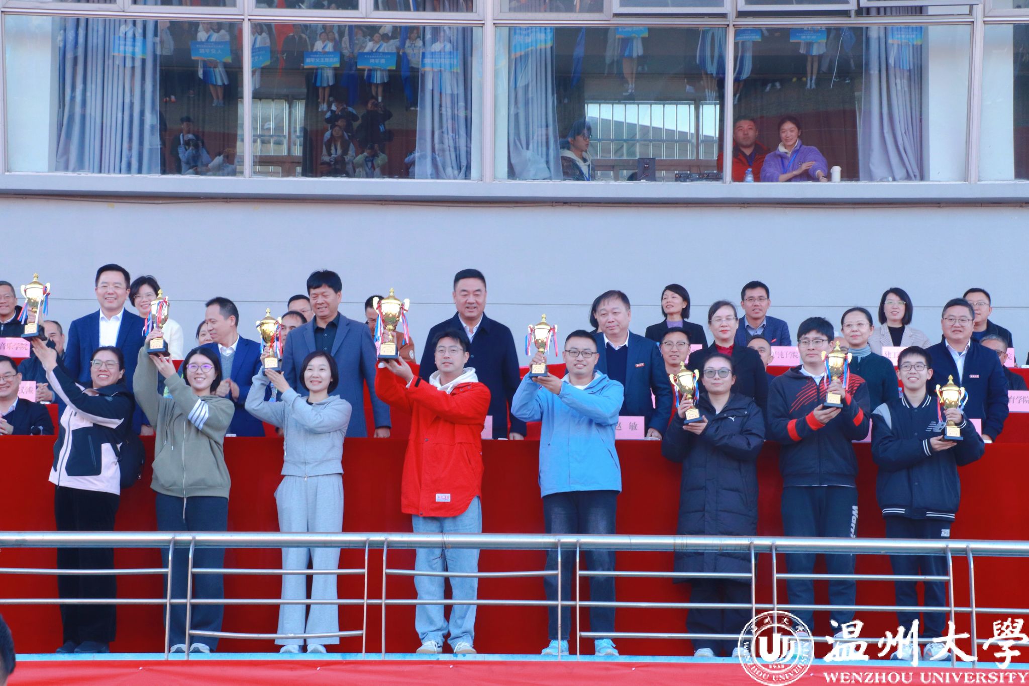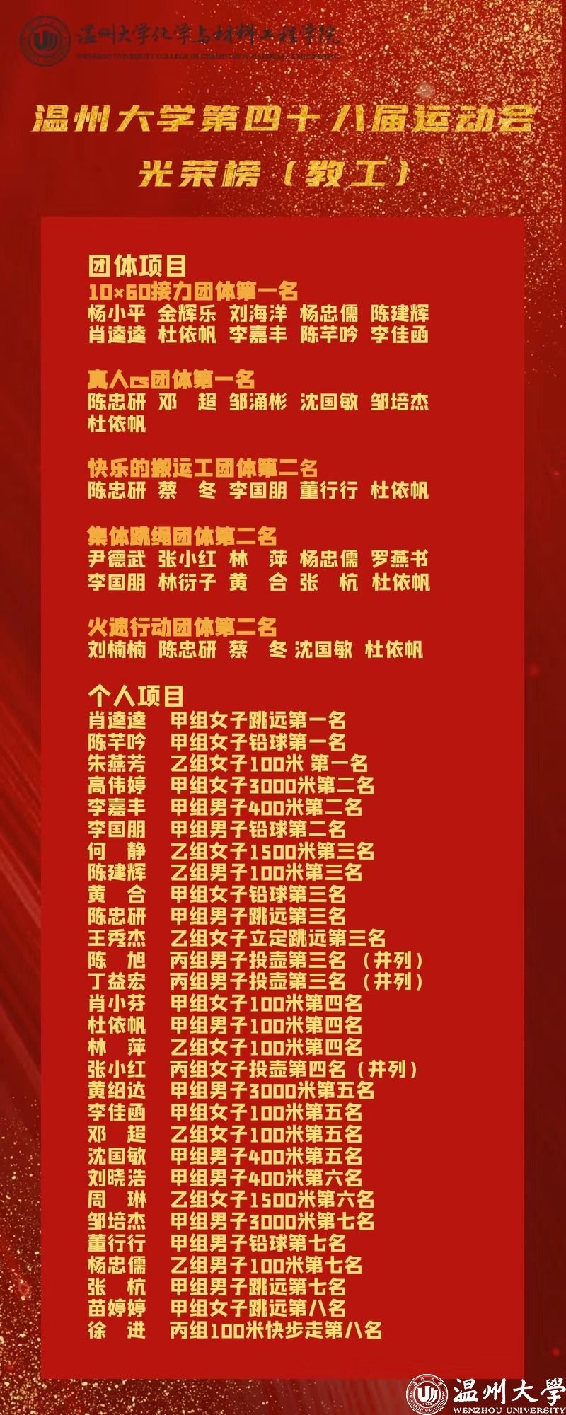 温州大学第四十八届运动会于 11 月 20 日至 21 日在北校区体育场圆满落幕。化学与材料工程学院教工代表队以昂扬斗志与出色协作,蝉联教工组团体总分第一桂冠,更以 211.2 分总成绩创下新高,成为赛场亮眼风景线。这一佳绩与学院近期科研领域的密集突破交相辉映,彰显化材人 “文武双全、追求卓越” 的精神底色。