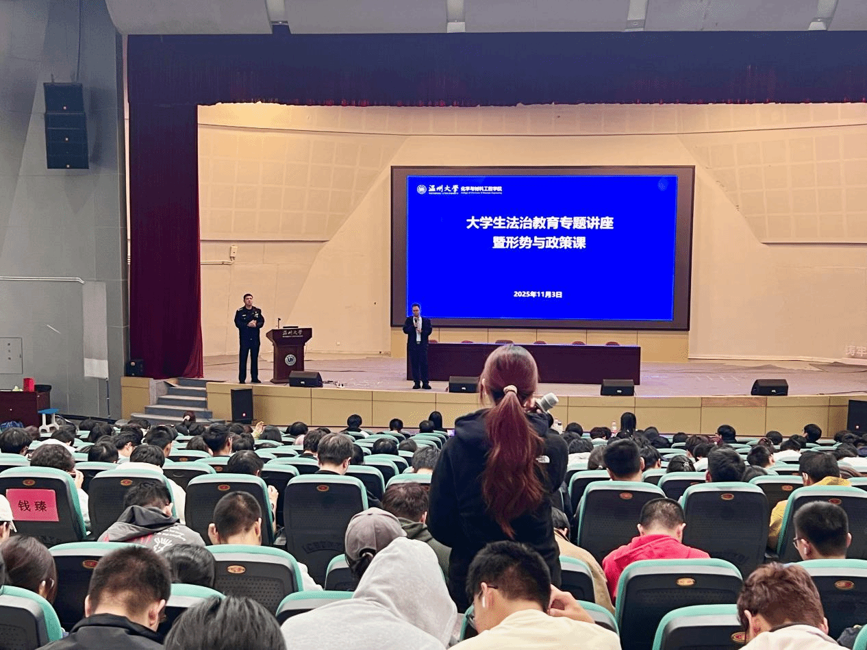 为落实大学生法治教育工作要求,提升学生法治观念与安全防范意识,筑牢校园安全防线,11月3日18时30分,化材学院在南9号楼报告厅举办大学生法治教育专题讲座。茶山派出所潘鸿浩警长、陈志坚警官,浙江海昌律师事务所合伙人黄漫超律师,院党委副书记王晓华,学工办辅导员,2025 级全体本研新生及各年级班长、团支书、安全委员参会。讲座由“筑安”工程专项辅导员李政主持。