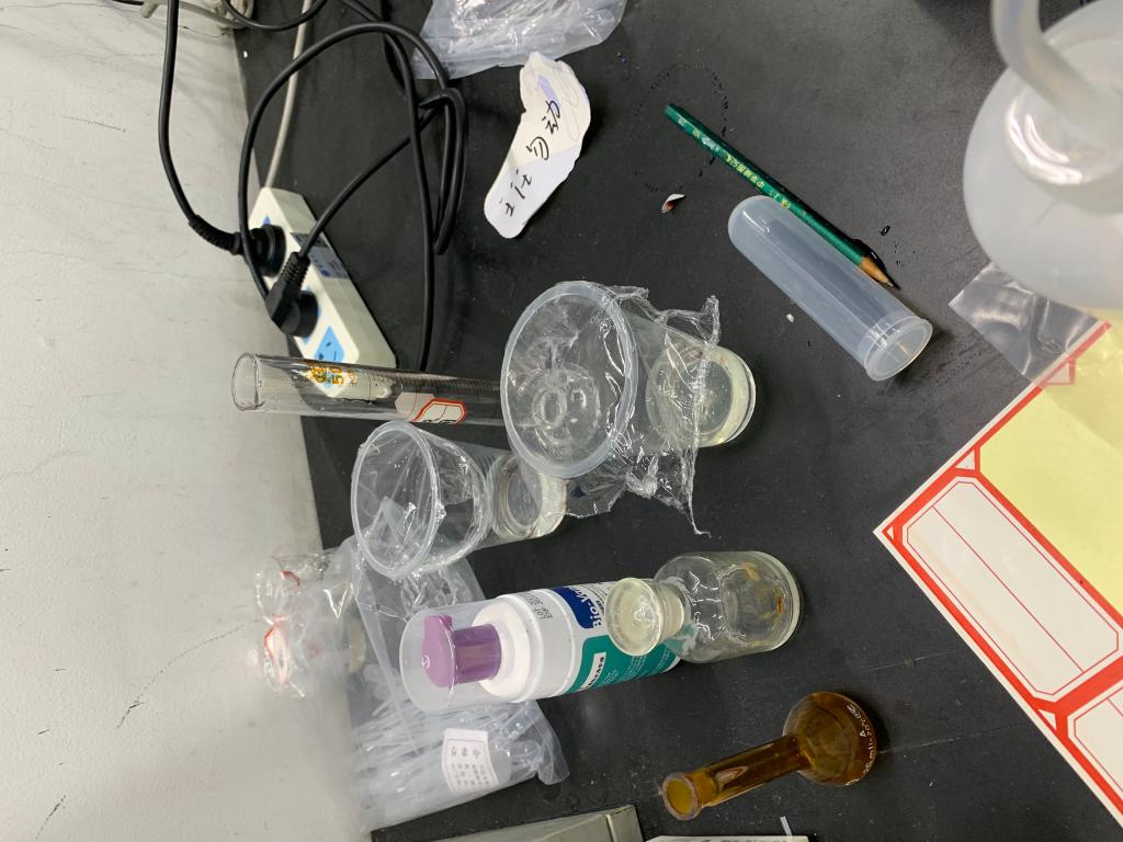 使用饮料瓶存放试剂,但未贴标签 |