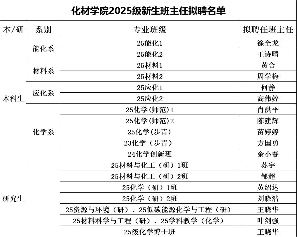 根据《温州大学关于加强班主任队伍建设的实施意见》和学院关于2025级新生班主任选聘工作的通知,经个人申请、系部推荐、学院党政联席会议审定,现将拟任学院2025级新生班主任名单及带班情况进行公示。