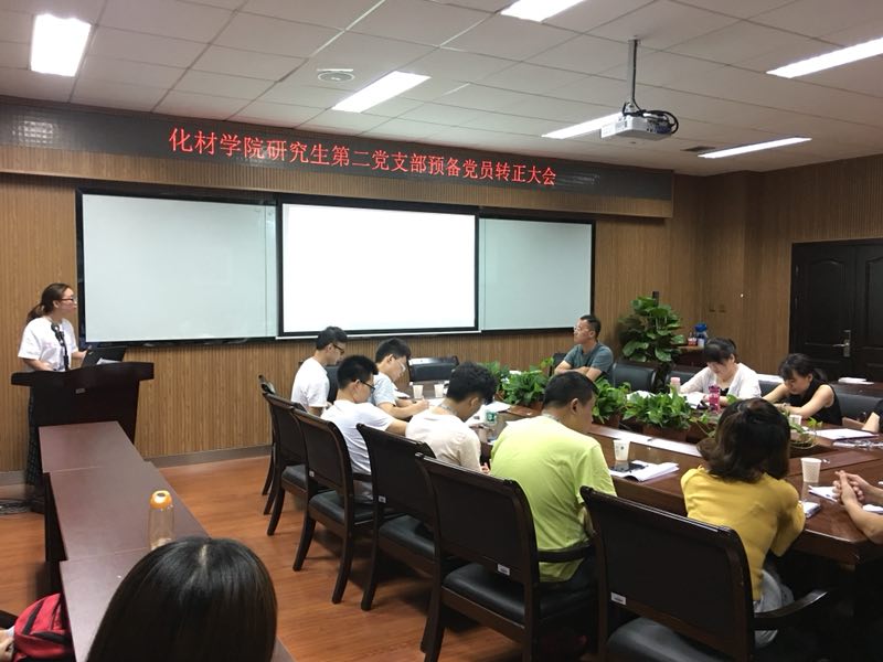 2018年6月13日晚上,化材学院研究生第二党支部在化材楼11B-204室召开预备党员转正大会,大会主要讨论贾晋虹、王翻同志由预备党员转为正式党员的问题,参与本次大会的有研究生辅导员邹涌彬老师,研究生第二党支部全体党员、预备党员。本次大会由研究生第二党支部书记李鸿辰主持。