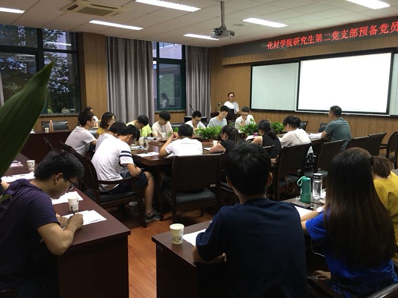 化材学院研究生第二党支部于6月13日下午两点,在化材楼11B525召开发展对象吸收为预备党员会议,出席人员有:研究生党建指导老师邹涌彬、支部全体党员以及本次转为预备党员的7名同学,本次活动对其中4名同学(分别是:王梦竹、丁伟杰、张晶晶、周磊)转为预备党员进行充分讨论。 6月13日晚上六点,在化材楼11B204就其他3名同学(分别是:许涛、杨超、金嫦)转为预备党员进行充分讨论。