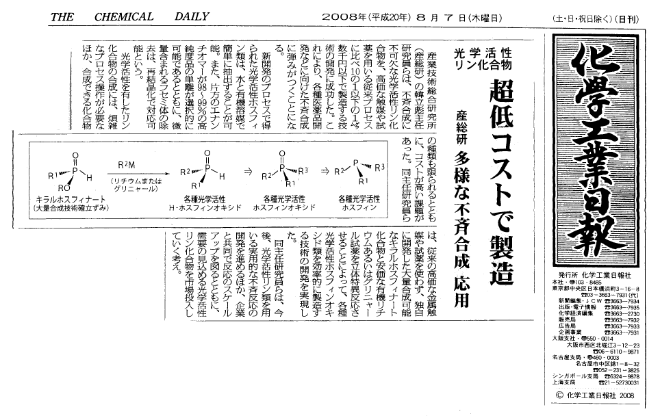 (37) Lei Yu,* Yulan Wu, Hongen Cao, Xu Zhang, Xinkang Shi, Jie Luan, Tian Chen, Yi Pan, Qing Xu.* Facile Synthesis of 2-Methylenecyclobutanones via Ca(OH)2-Catalyzed Direct Condensation of Cyclobutanone with Aldehydes and (PhSe)2-Catalyzed Baeyer-Villiger Oxidation to 4-Methylenebutanolides. Green Chem. 2014, 16 (1), 287-293 (SCI-II, IF: 8.02).  (38) Erlei Zhang, Haiwen Tian, Sendong Xu, XiaochunYu, Qing Xu.* Iron-Catalyzed Direct Synthesis of Imines from Amines or Alcohols and Amines via Aerobic Oxidative Reactions under Air. Org. Lett. 2013, 15 (11), 2704-2707 (SCI-II, IF: 6.364). 被Organic Chemistry Portal摘录:  (39) Quan Liu, Zhongxiang Lu, Wenfei Ren, Kaibo Shen, Yu Wang, Qing Xu.* Efficient Synthesis of Unsymmetrical Heteroaryl Ethers by a Transition Metal-Free C-O Cross-Coupling Reaction of Activated and Unactivated Heteroaryl Chlorides with Alcohols and Phenols. Chin. J Chem. 2013, 31 (6), 764-772 (SCI, IF: 0.917).  (40) Bo Huang, Haiwen Tian, Shoushuai Lin, Meihua Xie, Xiaochun Yu,* Qing Xu.* Cu(I)/TEMPO-Catalyzed Aerobic Oxidative Synthesis of Imines Directly from Primary and Secondary Amines under Ambient and Neat Conditions. Tetrahedron Lett. 2013, 54 (22), 2861-2864 (SCI-III, IF:  (41) Qing Xu,* Yong-Bo Zhou, Chang-Qiu Zhao, Shuang-Feng Yin, Li-Biao Han.* Transition Metal-Catalyzed Efficient and Green Transformations of P(O)−H Compounds to Functional Organophosphorus Compounds. Mini-Rev. Med. Chem. 2013, 13 (6), 824-835 (SCI-III, IF: 2.903). (42) Qing Xu,* Jianhui Chen, Quan Liu. Aldehyde-Catalyzed Transition Metal-Free Dehydrative β-Alkylation of Methyl Carbinols with Alcohols. Adv. Synth. Catal. 2013, 355 (4), 697-704 (SCI-II, IF: 5.663).  (43) Lei Yu,* Yulan Wu, Tian Chen, Yi Pan, Qing Xu.* Direct Synthesis of Methylene-1,2-dichalcogenolanes via Radical [3+2] Cycloaddition of Methylenecyclopropanes with Elemental Chalcogens. Org. Lett. 2013, 15 (1), 144-147 (SCI-II, IF: 6.364).  (44) Qing Xu,* Qiang Li, Xiaogang Zhu, Jianhui Chen. Green and Scalable Aldehyde-Catalyzed Transition Metal-Free Dehydrative N-Alkylation of Amides and Amines with Alcohols. Adv. Synth. Catal. 2013, 355 (1), 73-80 (SCI-II, IF: 5.663). 被Organic Chemistry Portal摘录:  (45) Qing Xu,* Qiang Li. Recent Advances of Transition Metal-Catalyzed Aerobic Dehydrative Reactions of Alcohols and Amines and Related Reactions. Chin. J. Org. Chem. 2013, 33 (1), 18-35 (SCI, IF: 0.741).  (46) Haiwen Tian, Xiaochun Yu, Qiang Li, Jianxin Wang, Qing Xu.* General, Green, and Scalable Synthesis of Imines from Alcohols and Amines by a Mild and Efficient Copper-Catalyzed Aerobic Oxidative Reaction in Open Air at Room Temperature. Adv. Synth. Catal. 2012, 354 (14-15), 2671-2677 (SCI-II, IF: 5.663). Cited and commented by as an exceptionally good method for imine preparation from alcohols and amines)   (47) Qing Xu, Chang-Qiu Zhao, Yong-Bo Zhou, Shuang-Feng Yin, Li-Biao Han.* Transition Metal-Catalyzed Transformations of P(O)-H Bonds. Chin. J. Org. Chem. 2012, 32 (10), 1761-1775 (SCI, IF: 0.741; 外封面论文).  (48) Xiaochun Yu, Lan Jiang, Qiang Li, Yuanyuan Xie, Qing Xu.* Palladium-Catalyzed N-Alkylation of Amides and Amines with Alcohols Employing the Aerobic Relay Race Methodology. Chin. J. Chem. 2012, 30 (10), 2322-2332 (SCI, IF: 0.917).  Highlighted by Org. Biomol. Chem. as Outside Front Cover Paper. Featured in the top 10% of the most highly cited articles published in the latest Impact Factor window 2011-2012)  (50) Shiheng Liao, Kangkang Yu, Qiang Li, Haiwen Tian, Zhengping Zhang, Xiaochun Yu, Qing Xu.* Copper-Catalyzed C-Alkylation of Secondary Alcohols and Methyl Ketones with Alcohols Employing the Aerobic Relay Race Methodology. Org. Biomol. Chem. Highlighted by Org. Biomol. Chem. as Front Cover Paper. Featured in the top 10% of the most highly cited articles published in the latest Impact Factor window 2011-2012)  (51) Xiaochun Yu, Chuanzhi Liu, Lan Jiang, Qing Xu.* Manganese Dioxide Catalyzed N-Alkylation of Sulfonamides and Amines with Alcohols under Air. Org. Lett. 2011, 13 (23), 6184-6187 被Organic Chemistry Portal摘录:  (52) Lan Jiang, Luolu Jin, Haiwen Tian, Xueqin Yuan, Xiaochun Yu,* Qing Xu.* Direct and Mild Palladium-Catalyzed Aerobic Oxidative Synthesis of Imines from Alcohols and Amines under Ambient Conditions. Chem. Commun. 2011, 47 (38), 10833-10835 (SCI-II, IF: 6.834). 、  (53) Chuanzhi Liu, Shiheng Liao, Qiang Li, Sunlin Feng, Qing Sun, Xiaochun Yu,* Qing Xu.* Discovery and Mechanistic Studies of a General Air-Promoted Metal-Catalyzed Aerobic N-Alkylation Reaction of Amides and Amines with Alcohols. J. Org. Chem. 2011, 76 (14), 5759-5773 (SCI-II,  (54) Sun Lin Feng, Chuan Zhi Liu, Qiang Li; Xiao Chun Yu, Qing Xu.* Rhodium-Catalyzed Aerobic N-Alkylation of Sulfonamides with Benzylic Alcohols. Chin. Chem. Lett. 2011, 22 (9), 1021-1024. (SCI, IF: 1.21) 、《中国化学快报》2013年度高被引论文 (55) Chuanzhi Liu, Xufeng Zang, Baohua Yu, Xiaochun Yu,* Qing Xu.* Microwave-Promoted TBAF-Catalyzed SNAr Reaction of Aryl Fluorides and ArSTMS: an Efficient Synthesis of Unsymmetrical Diaryl Thioethers. Synlett, 2011, (8), 1143-1148 (SCI-III, IF: 2.655).  (56) Qing Xu, Ruwei Shen, Yutaka Ono, Ritsuko Nagahata, Shigeru Shimada, Midori Goto, Li-Biao Han.* A New Oxapalladacycle Generated via Ortho C-H Activation of Phenylphosphinic Acid: Efficient Catalyst for Markovnikov-Type Additions of E-H Bonds to Alkynes. Chem. Commun. 2011, 47 (8), 2333-2335 (SCI-II, IF: 6.834). 被Organic Chemistry Portal摘录: 被Labome摘录:  (57) Qing Xu, Han, Li-Biao.* Metal-catalyzed additions of H-P(O) bonds to carbon-carbon unsaturated bonds. J. Organometallic Chem. 2011, 696 (1), 130-140 (SCI, IF: 2.0).  (58) Qing Xu,* Li-Biao Han.* Transition Metal-Catalyzed Selective Hydrophosphorylation Reactions. (59) Qing Xu, Chang-Qiu Zhao, Li-Biao Han.* Stereospecific Nucleophilic Substitution of Optically Pure H-Phosphinates: A General Way for the Preparation of Chiral P-Stereogenic Phosphine Oxides. J. Am. Che
