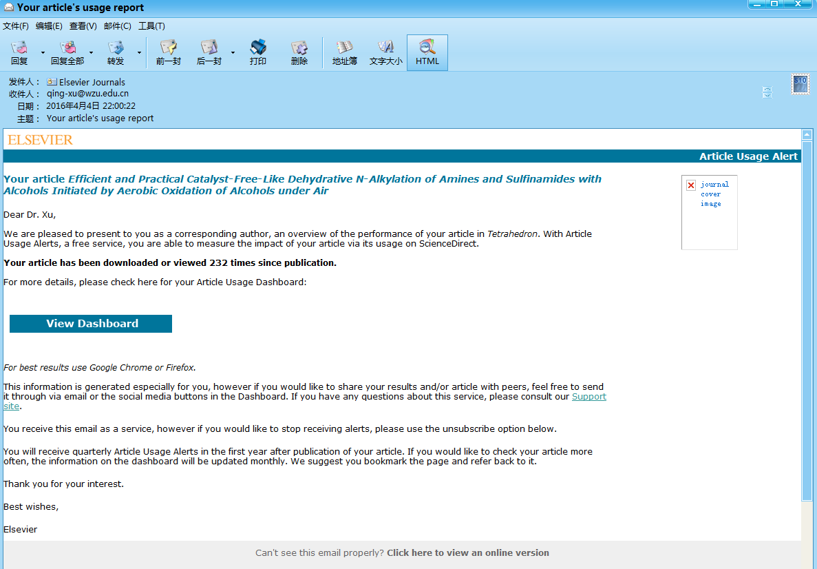(22) Xiaohui Li, Shuangyan Li, Qiang Li, Xu Dong, Yang Li, Xiaochun Yu, Qing Xu.* Efficient and Practical Catalyst-Free-Like Dehydrative N-Alkylation of Amines and Sulfinamides with Alcohols Initiated by Aerobic Oxidation of Alcohols under Air. Tetrahedron 2016, 72 (2), 264-272 (SCI-III, IF: 2.641). .   (23) Lei Yu,* Yaping Huang, Zheng Wei, Yuanhua Ding, Chenliang Su,* Qing Xu.* Heck Reactions Catalyzed by Ultrasmall and Uniform Pd Nanoparticles Supported on Polyaniline. J. Org. Chem.2015, 80 (17), 8677–8683 (SCI-II,IF: 4.721). 被X-MOL化学咨询平台亮点摘录:  (24) Lei Yu,* Jianqing Ye, Xu Zhang, Yuanhua Ding, Qing Xu.* Recyclable (PhSe)2-catalyzed selective oxidation of isatin by H2O2: a practical and waste-free access to isatoic anhydride under mild and neutral conditions. Catal. Sci. Technol. 2015, 5 (10), 4830-4838 (SCI-II, IF: 5.426).