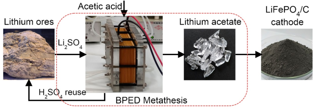 该工作利用初级锂盐Li2SO4和CH3COOH通过双极膜电渗析复分解反应转化为高价值的CH3COOLi产品。结合蒸发浓缩法,当溶液冷却至室温可得到厘米级的CH3COOLi晶体,其SO42-杂质含量仅0.075%。而且全流程核算的总成本显示该过程具有明显的成本优势。因此,双极膜电渗析与蒸发浓缩集成工艺是一个经济有效、高产、环境友好的绿色合成工艺路线,该工作有利于推动醋酸锂作为LiFePO4/C前驱体的工业应用,为锂离子电池发展助力。