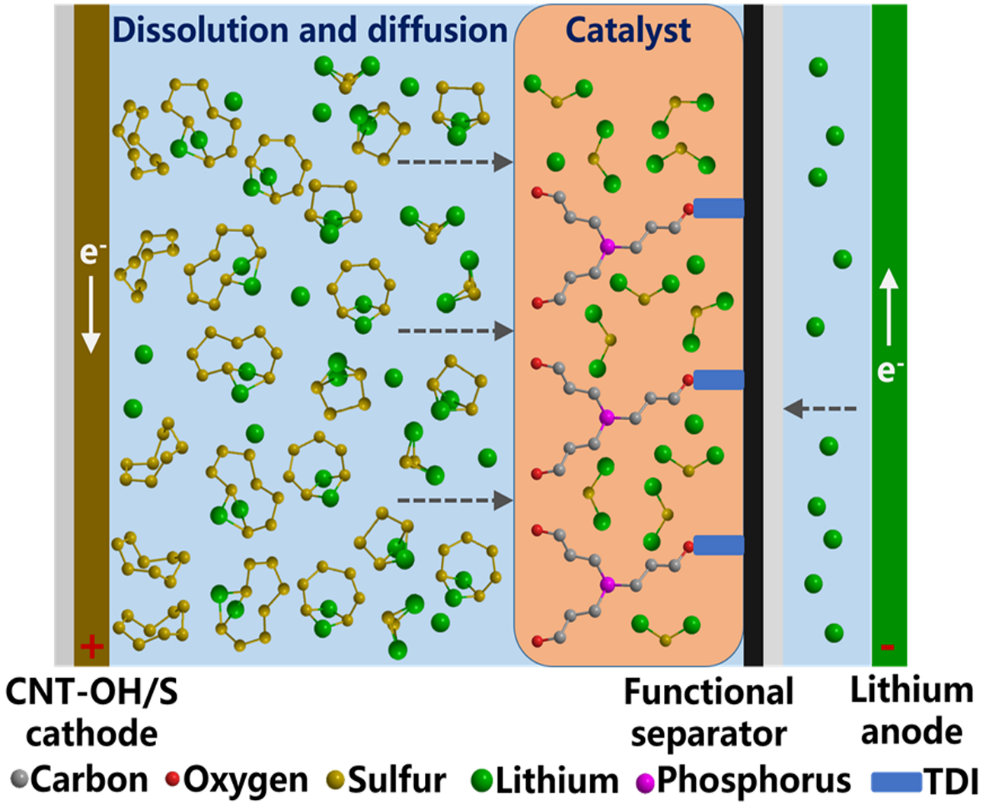 陈锡安教授课题组在国际顶级期刊《Angewandte Chemie International Edition》发表题为“Hydroxylated Multi-walled Carbon Nanotubes Covalently Modified with Tris(hydroxypropyl) Phosphine as a Functional Interlayer for Advanced Lithium-Sulfur Batteries”的论文。该工作开发了一种三(羟丙基)膦共价改性羟基化多壁碳纳米管作为先进锂硫电池的功能层。利用三(羟丙基)膦(THPP)作为锂硫电池功能插层中的活性物质,能够快速将液相多硫化锂(Li2Sn, 4≤n≤8)催化转化固相硫化锂(Li2S),从而有效抑制多硫化物穿梭效应。同时能够诱导锂负极表面形成稳定的固体电解液中间相(SEI)层,进而减少锂负极枝晶的形成。并揭示了有机小分子THPP催化多硫化物过程中形成的活性中间体,对锂硫电池中有机小分子催化多硫化物的作用机制提供了一个新的见解。