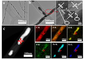 (3)一方面通过N,P等非金属杂原子的多重掺杂使得碳材料的非本征缺陷增加,进而增加电子的自旋密度以及电子云的不对称性,致使催化活性的提升;另一方面原位引入铁络合物增加材料的赝电容,同时结合碳纳米管的限域作用增加碳基材料的电化学稳定性。