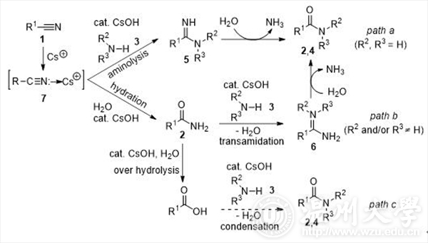 机理研究表明,该反应的机理与文献过渡金属催化胺解反应也有所不同。如下图所示,腈1首先在铯效应下被活化得到活化的腈7:1)氨水参与的反应中,7在CsOH的催化下与氨发生快速的加成反应得到脒中间体5,然后快速水解得到对应的一级酰胺产物2(历程a);2)在伯胺或仲胺参与的反应中,7先在CsOH的催化下发生水合反应生成酰胺2,然后跟胺3发生转胺化反应得到脒中间体6,6再水解得到对应的二级或三级酰胺产物4(历程b)。由于当前的反应条件下,酸与氨或胺都不能得到酰胺产物,因此腈过度水解生成酸的历程c被排除。详见:Green Chem. 2016, 18, 4865;DOI: 10.1039/C6GC01565D