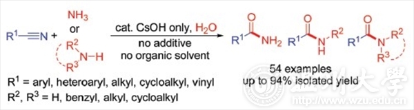 徐清教授在前期Cs对腈的活化作用及CsOH/DMSO催化腈的水合反应合成一级酰胺 (Green Chem. 2014, 16, 2136)等新发现的基础上,指导研究生李洋、陈浩楠等同学巧妙利用铯效应对腈的活化作用,使用水溶性CsOH为催化剂催化腈与氨水、伯胺、仲胺的胺解反应分别合成一级、二级和三级酰胺。该反应无需使用有机溶剂和任何添加剂,并且有着广泛的底物适用性。无论芳基、杂芳基、烷基,甚至烯丙基型的腈都可以与氨、芳基、烷基、环烷基的一级胺、环烷基的二级胺发生胺解反应得到相应的酰胺产物,收率范围28-94%。因此,与文献上已知的使用H2S为助剂的方法、或者Pt、Ru、Zn、Cu、Ce、Fe、Co等过渡金属催化腈胺解方法、或者格氏试剂RMgX对腈的加成水解方法相比较,该新方法有很多的优势。