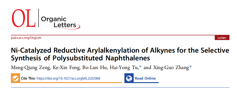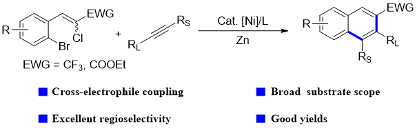 论文题目:Ni-Catalyzed Reductive Arylalkenylation of Alkynes for the Selective Synthesis of Polysubstituted Naphthalenes.