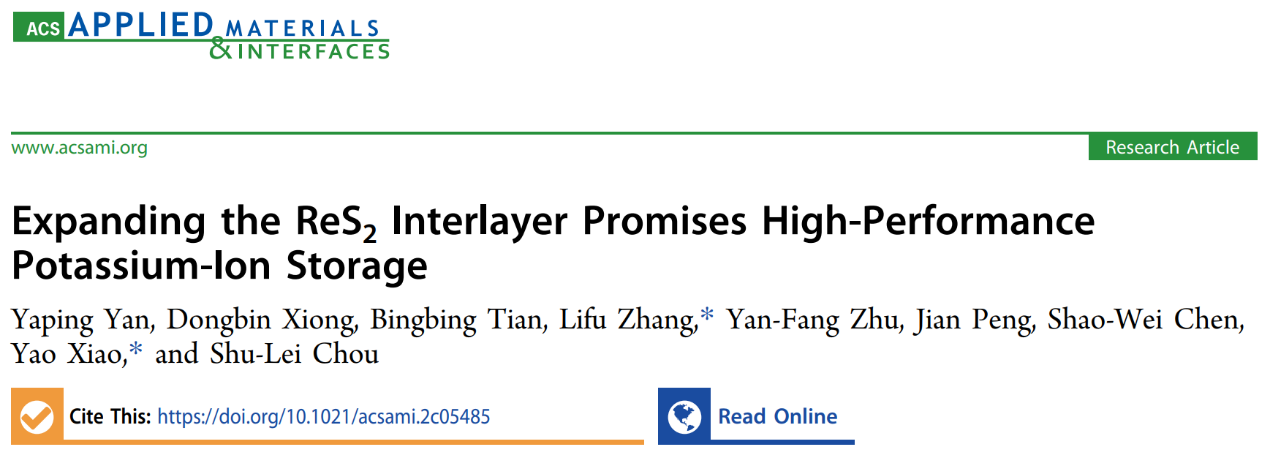 化材学院碳中和技术创新研究院肖遥团队在国际权威期刊《ACS Applied Materials & Interfaces》(//pubs.acs.org/doi/abs/10.1021/acsami.2c05485)上发表题为“Expanding the ReS2 Interlayer Promises High-Performance Potassium-ion Storage”的研究论文。本文利用二维层状材料的特点,采用二维材料层间距扩大的策略,通过简单的水热法,在还原氧化石墨烯(rGO)表面上合成了扩层的ReS2纳米片。所制备的ReS2纳米片的层间距为~ 0.77 nm,远大于扩层前的0.61 nm。采用原位XRD技术研究了ReS2在钾离子电池中的离子存储机制,揭示了钾离子在扩层ReS2中嵌入和转换两种混合的模式。扩层的纳米复合材料在0.05、0.2 和 1.0 A/g电流密度下表现出 432.5、316.5和241 mAh/g的高比容量,并在1A/g的电流密度下,表现出优异的可逆性。总体而言,这种材料局域化学策略也为其他材料的开发应用提供了新的借鉴。