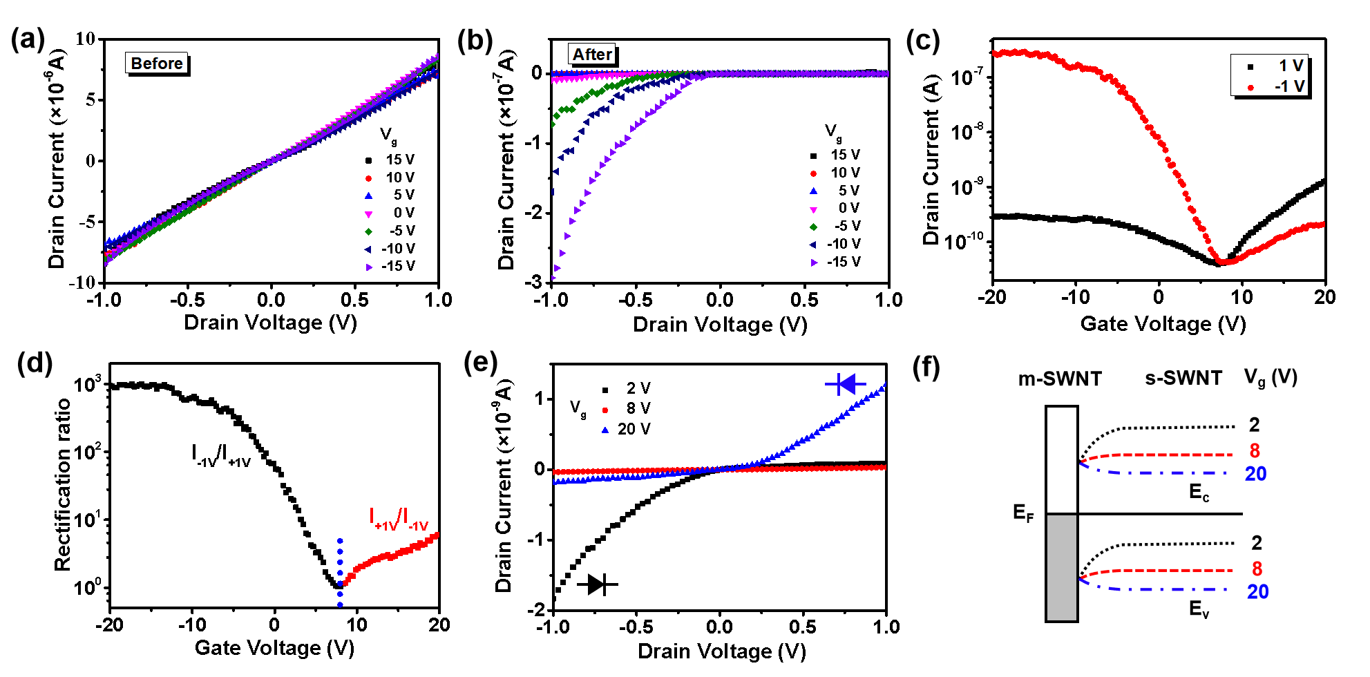 胡悦特聘教授团队联合广东工业大学黄少铭教授与吉林大学赵秋辰教授,提出了一种选区自由基反应制备单壁碳纳米管肖特基结。如图1所示,聚甲基丙烯酸甲酯(PMMA)被用来旋涂在硅片表面,进而采用电子束光刻技术来暴露金属性单壁碳纳米管的部分区域。这部分的金属性单壁碳纳米管进行自由基反应从而转化为半导体性单壁碳纳米管,最后形成金属性-半导体性单壁碳纳米管肖特基结。
