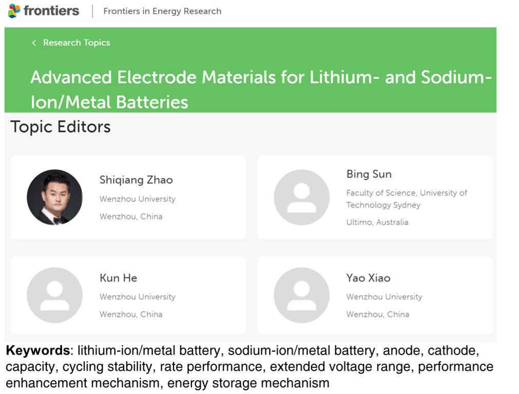 赵世强、何坤和肖遥博士和悉尼科技大学孙兵博士受邀担任国际能源期刊《Frontiers in Energy Research》(《能源研究前沿》)电池专刊“Advanced Electrode Materials for Lithium- and Sodium-Ion/Metal Batteries”(锂/钠离子及金属电池先进电极材料)的Guest Editor(客座主编)。