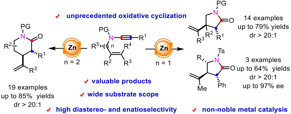 钱鹏程-李龙教授课题组实现了烯烃取代内酰胺的高效、多样性合成。该方法研究了在锌催化剂作用下,烯炔酰胺化合物的分子间氧化环化反应。这种廉价金属催化的氧化环化反应具有高产率和优异的区域选择性、立体选择性等优点。