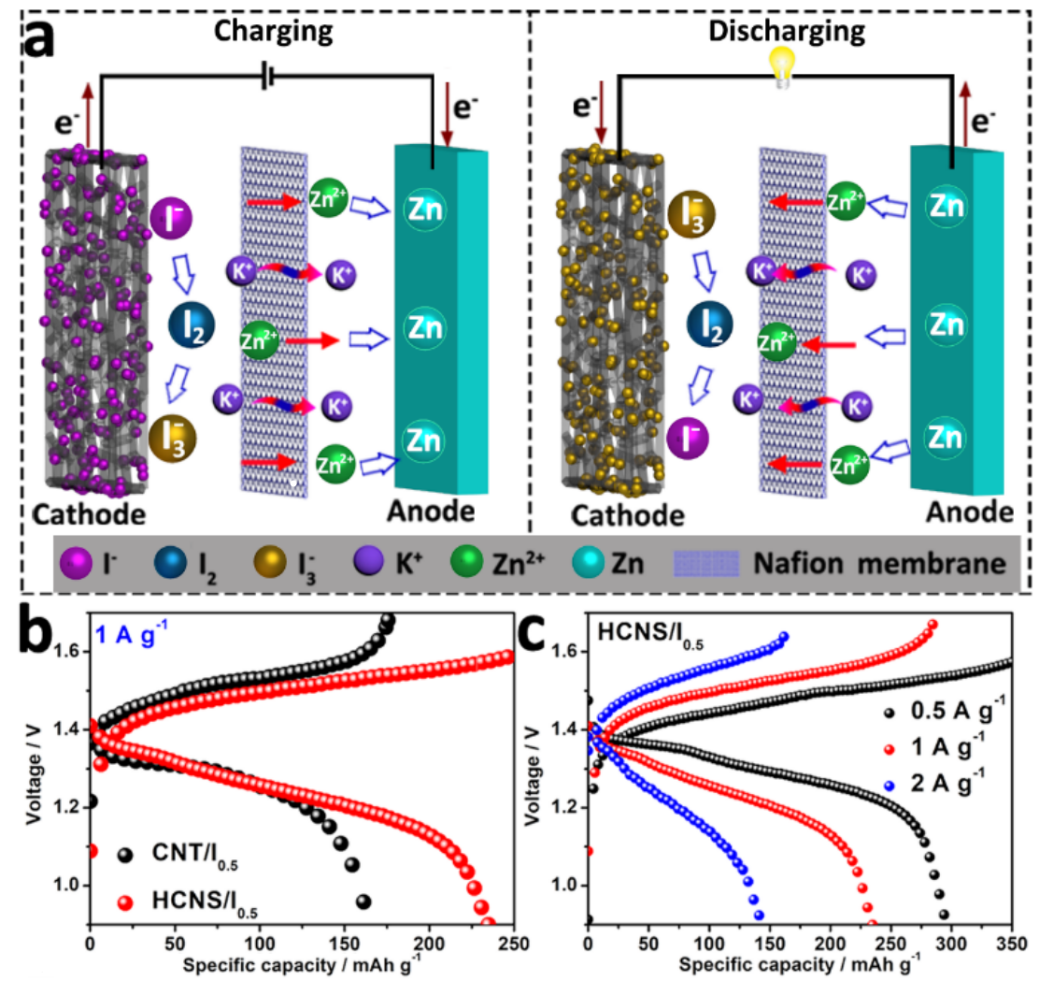 钱金杰课题组通过对In-MOF热裂解过程中配体脱羧和氧化铟纳米颗粒氧化还原反应的调控,进而形成的液态金属铟通过熔聚和重力作用从碳纳米内腔中聚集流出形成空腔,从而获得中空结构的多孔碳材料(HCNS)。这种纳米秸秆形状的HCNS催化剂具有远高于CNTs的电化学交换能力。HCNS具有更多的电荷活性位点、短而快速的电子和离子传输途径,以其独特的内腔和管壁上相互连接的多孔结构,成功获得新一代高性能理想正极材料。其中,HCNS/I0.5展现出优于商业CNTs材料的高比容量(484.9 mAh g-1@1 A g-1)和较好的倍率性能。在此基础上组装的锌碘电池在1 A g-1时提供了246.6 mAh g-1的高容量,保证了电解液中碘物质的吸附和溶解平衡,极大地提高了该电池的倍率和循环性能,从而获得了优异的容量保持率。