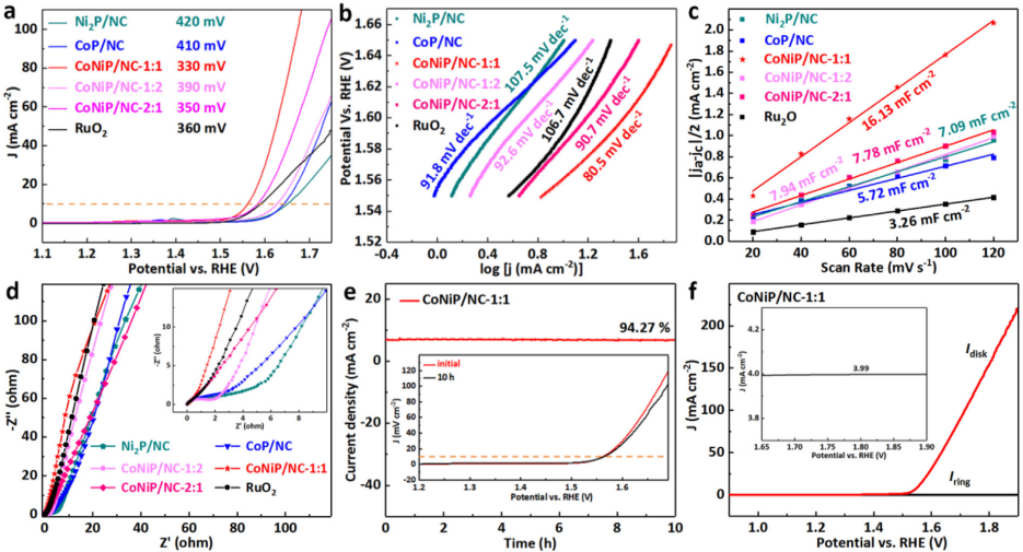 钱金杰课题组以一系列Co/Ni基同构MOF(CoNi-ABDC)为前驱体,经过碳化及磷化处理后合成了双金属磷化物纳米颗粒锚定的氮掺杂碳纳米条复合材料CoNiP/NC-X,可将其作为高性能OER催化剂。所获得的CoNiP/NC-1纳米带具有良好的纳米结构、高比表面积、适量的杂原子掺杂、丰富的催化活性位点和高度石墨化的碳网络。因此,该材料在碱性溶液中表现出良好的准四电子OER性能,当电流密度为10 mA cm-2时,过电位为330 mV,Tafel斜率为80.5 mV dec-1,并在10 h稳定性测试后电流保持率为94.27%。