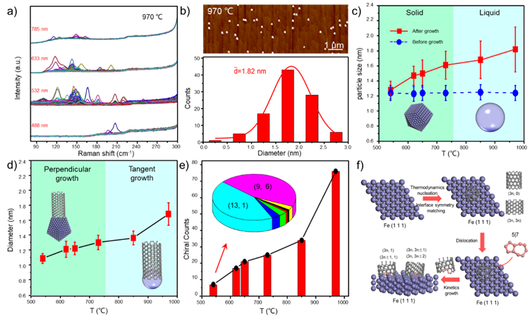 图4. (a)利用液体“特洛伊”催化剂在970°C下生长的SWNTs在不同激发波长下(488nm、532nm、633nm和785nm)的拉曼表征图。(b)利用液体“特洛伊”催化剂在970°C下生长的SWNTs的AFM图(顶部)和催化剂尺寸分布图。(c)催化剂在生长SWNTs前后的粒径变化与温度的关系图,表明催化剂在低温下为固体,在高温下为液体。(d)利用“特洛伊”催化剂生长的SWNTs的直径分布与温度的关系图,低温下为垂直生长模式,高温下为切线生长模式。(e)手性种类与温度变化关系图。尤其是在540°C时,手性种类的演变表明SWNTs手性高度富集。(f)位错引发的热力学成核和动力学生长导致(13,1)和(9,6)SWNTs在540°C下使用固体“特洛伊”催化剂优先生长。
