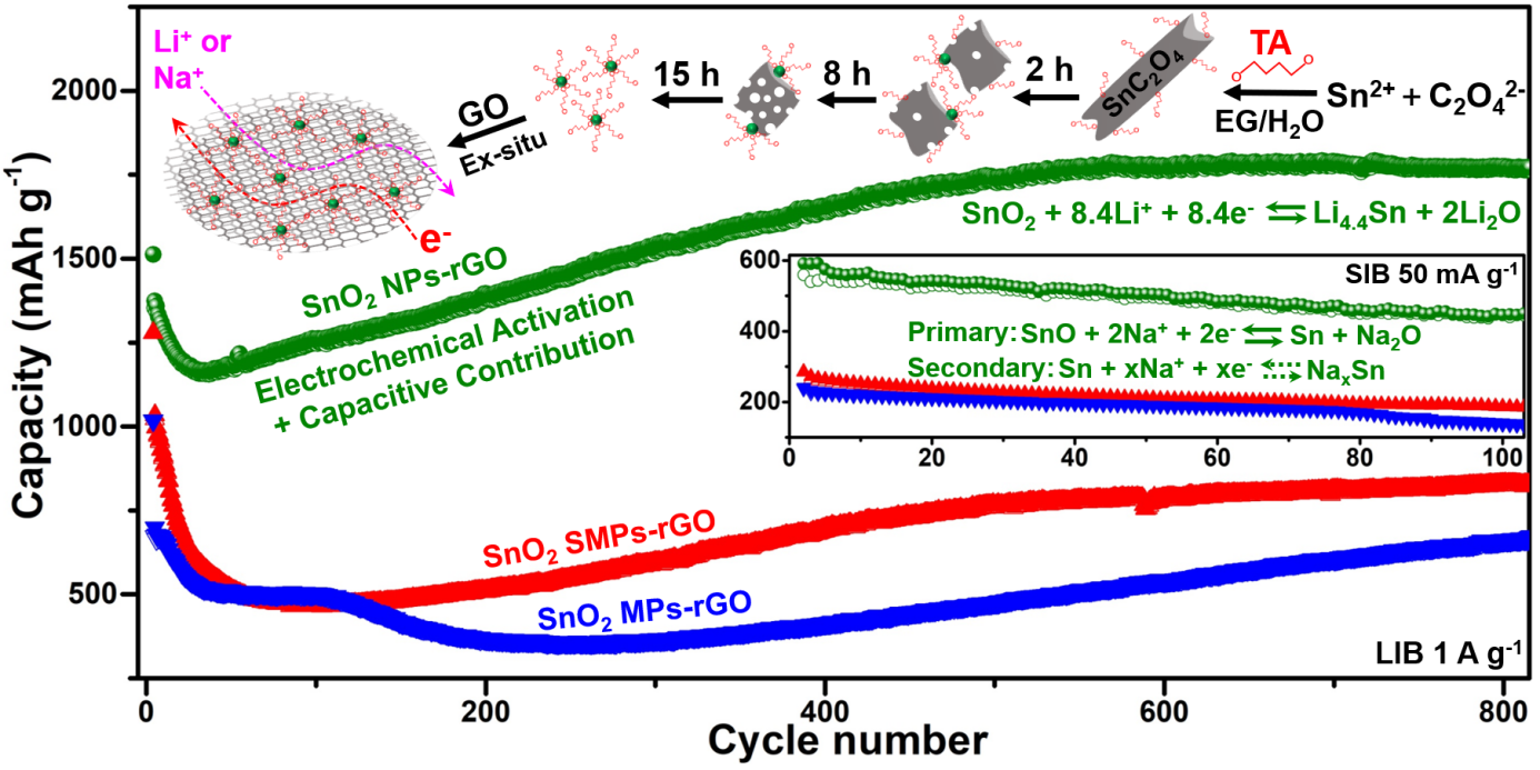 图1. 溶剂热驱动固-固转化(SDSST)合成策略示意图,SnO2 NPs-rGO纳米复合材料作为锂/钠离子电池负极的循环稳定性能图。