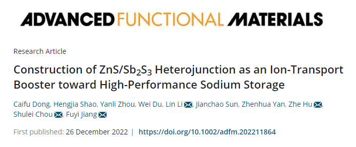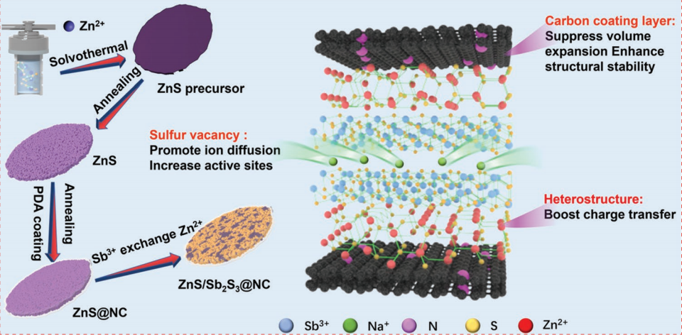 碳中和技术创新研究院李林团队联合烟台大学和深圳大学在国际权威期刊Advanced Functional Materials上发表题为《Construction of ZnS/Sb2S3 Heterojunction as an Ion-Transport Booster toward High-Performance Sodium Storage》的学术论文。该工作通过阳离子交换法将Sb2S3引入ZnS中,合成了氮掺杂碳包覆的ZnS/Sb2S3 (ZnS/Sb2S3@NC)异质结结构。理论计算和实验研究表明ZnS/Sb2S3@NC异质结结构的构建有效的提升了电荷转移速率。因此,ZnS/Sb2S3@NC表现出优异的循环稳定性(循环450圈后可逆容量为511.4 mAh g-1)和倍率性能(在10 A g-1电流密度下的可逆容量为400.4 mAh g-1)。此外,通过X射线衍射和高分辨率透射电镜深入研究了ZnS/Sb2S3@NC的储钠机理。最后,组装了ZnS/Sb2S3@NC//Na3V2(PO4)3/ rGO全电池,其在循环50圈后仍具有226.2 mAh g−1的可逆容量。人妻NTR相关的文章发表在Advanced Functional Materials上,人妻NTR