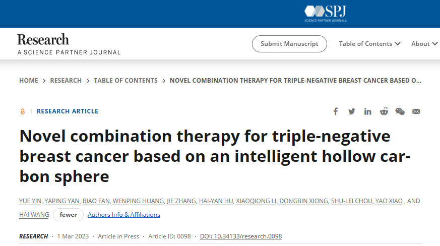 该成果以“Novel combination therapy for triple-negative breast cancer based on an intelligent hollow carbon sphere”为题发表在国际权威期刊《Research》上,IF:11.036,中科院期刊分区表1区。人妻NTR