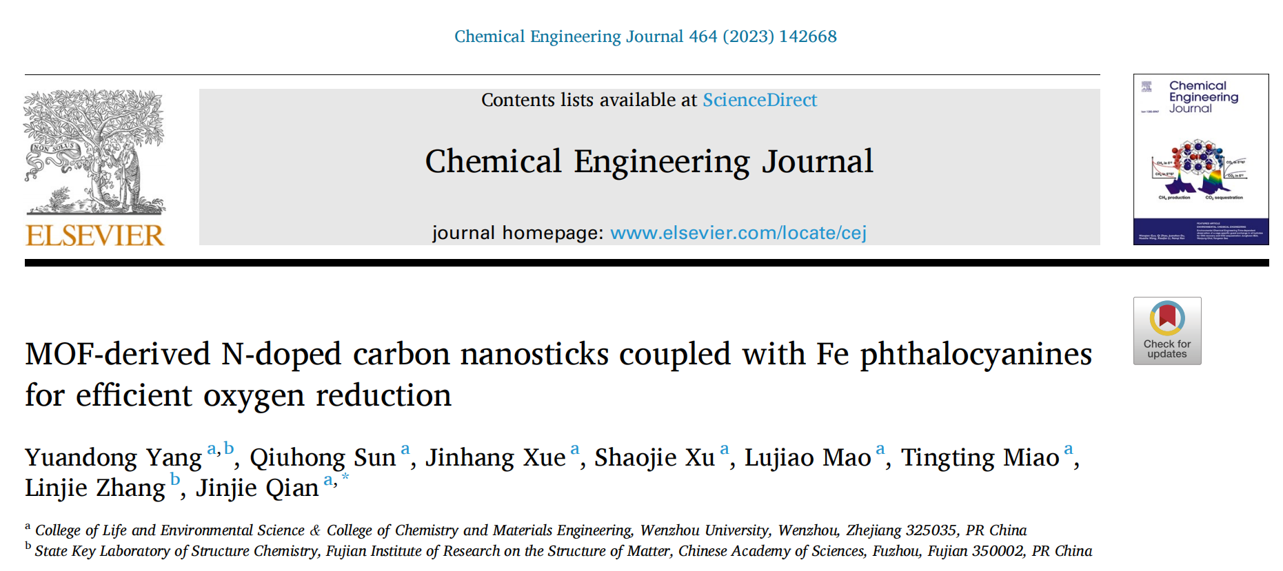 Yuandong Yang, Qiuhong Sun, Jinhang Xue, Shaojie Xu, Lujiao Mao, Tingting Miao, Linjie Zhang, and Jinjie Qian*. MOF-derived N-doped carbon nanosticks coupled with Fe phthalocyanines for efficient oxygen reduction. Chem. Eng. J., 2023, 464, 142668.