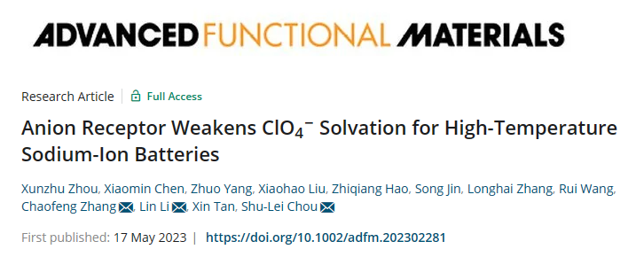 碳中和技术创新研究院李林团队联合安徽大学在国际权威期刊《Advanced Functional Materials》上发表题为《Anion Receptor Weakens ClO4–Solvation for High-Temperature Sodium-Ion Batteries》的学术论文。该工作引入了阴离子受体三(五氟苯基)硼烷(TPFPB)作为电解液添加剂,通过构建稳固且富含NaF的CEI膜提升电池的高温循环稳定性。密度函数理论(DFT)证明TPFPB和ClO4−阴离子之间通过B-O键表现出强相互作用,体现为两方面优势:其一,高氟化末端的TPFPB添加剂通过ClO4−阴离子参与中心Na+的溶剂化构型配位,并优先分解生成稳固且富含NaF的CEI膜;其二,削弱了ClO4−的溶剂化作用,促进溶剂与Na+阳离子的配位能力,显著提高电解液的氧化稳定性。所构筑的电解液在磷酸钒钠正极中,在4.2V的高截止电压(vs. Na+/Na)和60℃的高温条件下,100次循环后容量保持率达86.9%,并在-30至60°C的宽温域范围内展现出优异的高压稳定性及倍率性能。人妻NTR相关的文章发表在国际著名期刊Advanced Functional Materials上,人妻NTR