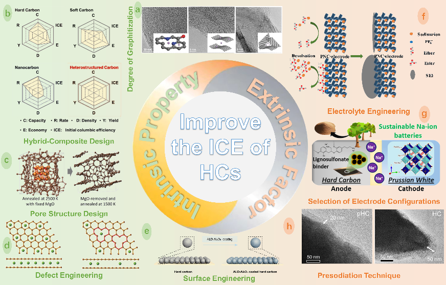 碳中和技术创新研究院吴星樵博士团队联合上海大学李丽副教授团队系统地介绍了硬碳负极材料首次库伦效率低的原因,并全面总结了改善硬碳首次库伦效率的有效策略和最新研究进展,包括内部的性质(石墨化程度、孔结构、缺陷等)和外部的因素(电解液、电极材料等),最后展望了硬碳在未来的实际应用和发展前景,以此促进钠离子电池的商业化进程。
