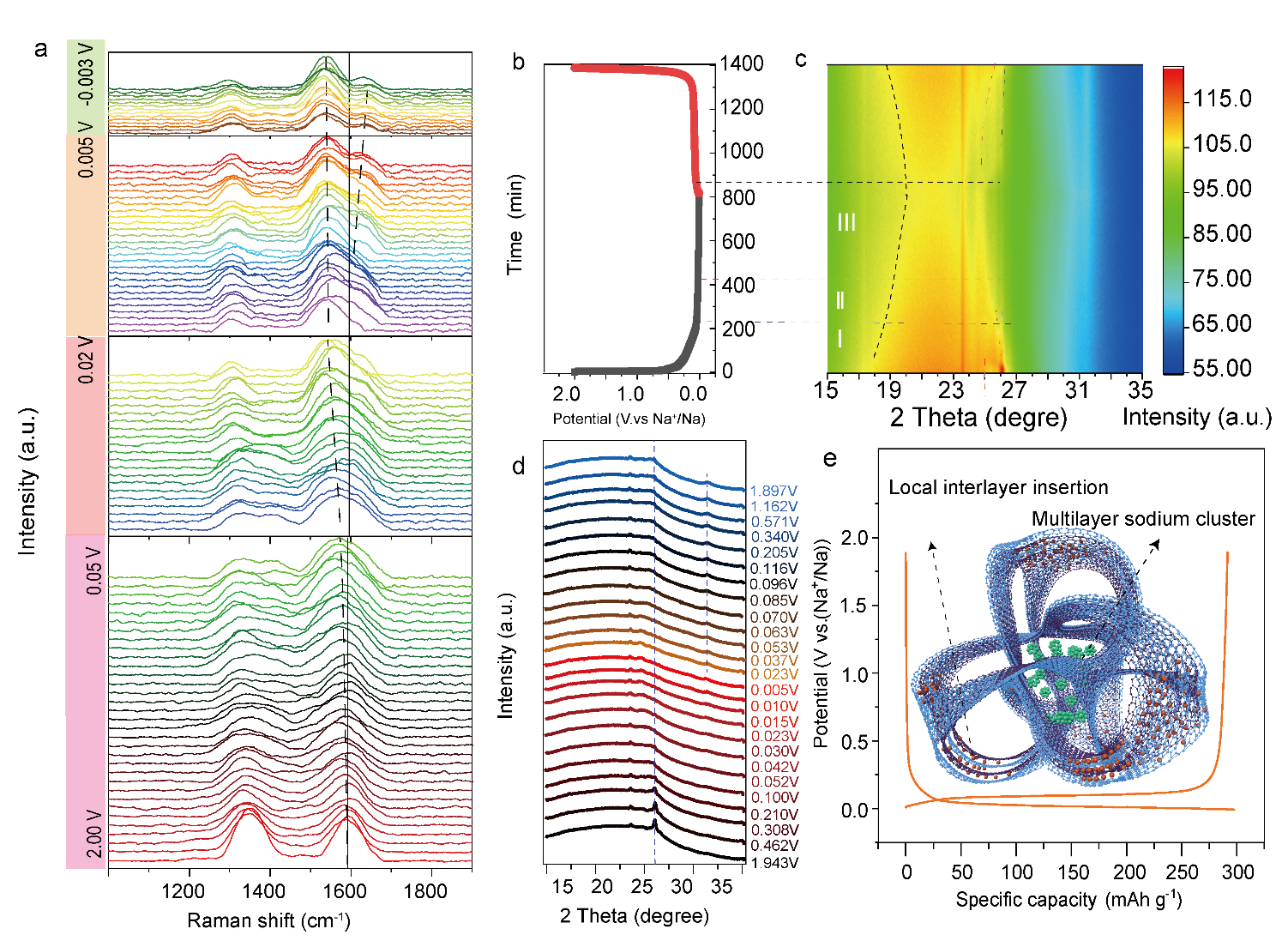 吴星樵博士课题组与上海大学李丽教授课题组合作提出了通过构建一种高度交联的拓扑石墨化碳以实现储钠容量与平台占比的兼顾,并通过一次/二次碳材料之间存在的结构联系性阐述了该拓扑石墨化碳的形成机理。多种原位表征显示这种由长程石墨烯纳米带卷曲形成的拓扑石墨化碳(H-TPGC)应用于钠离子电池负极侧时可实现钠离子的超致密嵌入,并且其极低的缺陷浓度限制了对应于高电位区域的钠离子的吸附。因此,该工作制备的H-TPGC材料其平台容量超过了290 mAh g-1,达到了其总可逆容量的97%,即实现了全平台储钠碳负极的成功制备。