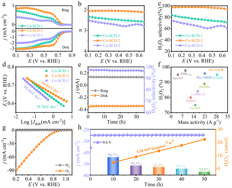 过氧化氢(H2O2)是一种多功能抗氧化剂,被广泛应用于化工合成、医疗消毒和纺织制造,并有望在可持续工业生产中发挥关键作用。目前,商业H2O2主要通过成熟的蒽醌氧化产生方法(>95%),具有产率高、制备规模大等优点。然而,该制备方法不仅涉及能耗高、过程复杂、还消耗过多的氢气以及昂贵的钯催化剂。近年来,电催化2电子氧还原反应 (2 e- ORR) 制备过氧化氢具有反应条件温和、制备过程简单等优点表现出极大的应用潜力。在过去几年中,过渡金属基催化剂由于其低廉价格和高催化活性,作为2 e- ORR商业催化剂的替代品受到了广泛关注。其中,钴(Co)元素在抑制活性位点的脱金属和自由基攻击方面具有优势,表现出优异的催化活性和稳定性,具有广阔的应用前景。已有多种策略(包括合金化、单原子和团簇等)被报道来增强2 e- ORR的活性并提高其合成H2O2选择性。其中,团簇不仅保留了单原子催化剂的优点(高原子利用率),还可以为中间体的吸附和活化提供丰富的活性位点,优化反应步骤的吸附行为。然而,据我们所知目前报道的Co基团簇催化剂由于配位环境差异对H2O2的选择性和产率还有待提升。