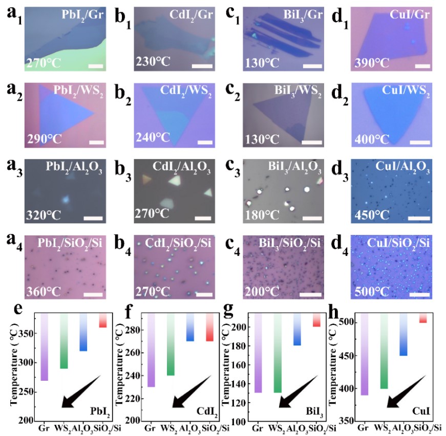 张礼杰研究员等人针对在二维材料的低温可控生长难题,发展了一种普适性的范德华衬底辅助低温外延生长策略,大幅降低了二维碘化物原子晶体的生长温度,实现了系列二维金属碘化物( PbI2、CdI2、BiI3、CuI)在较低温度下的可控生长。系统研究了范德华、非范德华衬底对二维碘化物生长的影响,结合 DFT 计算结合 MD 模拟,发现与蓝宝石衬底相比,碘化物分子在二维范德华衬底(石墨烯、二硫化钼等)的吸附能和扩散势垒大幅降低,适当的吸附能与较低的扩散势垒,促使范德华衬底表面晶体的横向生长。揭示了扩散势垒对二维碘化物生长的影响规律,为低温生长高质量二维材料提供了策略和理论指导,该研究成果以“Van der Waals template-assisted low-temperature epitaxial growth of 2D atomic crystals”为题目发表在在材料领域国际权威学术期刊《Advanced Functional Materials》,人妻NTR