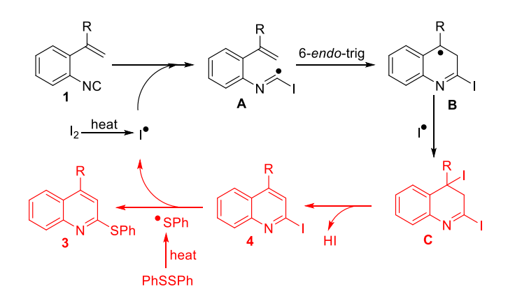 该反应机理为碘分子在高温下均裂产生碘自由基,碘自由基与异氰化物部分反应生成氨基酰基自由基中间体A。然后,中间体A与相邻的烯烃进行环化,得到更稳定的自由基中间体B。随后的自由基偶联提供中间体C,它失去HI生成碘化杂芳基4。同时,二硫化物可能在高温下分解生成硫自由基,硫自由基与碘化杂芳基4反应生成所需产物3和碘自由基。