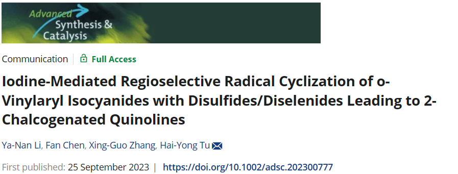 张兴国教授、涂海勇副教授、硕士生李亚男发展了一种碘介导的高效合成2-硫代喹啉类化合物的反应。相关成果以标题“Iodine-Mediated Regioselective Radical Cyclization of o-Vinylaryl Isocyanides with Disulfides/Diselenides Leading to 2-Chalcogenated Quinolines”(DOI: //doi.org/10.1002/adsc.202300777)发表在⟪Advanced Synthesis & Catalysis⟫上。在该工作中,作者以一种碘介导的邻乙烯基异氰酸酯与二硫化物/二硒化物的环化反应,为2-硫代喹啉的区域选择性合成提供了一种简洁高效的方法。首先,我们用1-异氰基-2-(1-苯基乙烯基)苯与二苯基二硫醚作为模型底物对条件进行了一系列筛选,结果显示我们使用0.5等量的I2作为添加剂,用1,4-二氧六环作为溶剂在100℃下反应12小时的时候产率可以达到92%。