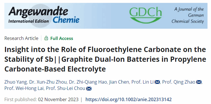 碳中和技术创新研究院李林团队联合南开大学赵庆教授以及澳大利亚伍仑贡大学赖伟鸿教授在国际权威期刊《Angewandte Chemie International Edition》上发表题为《Insight into the Role of Fluoroethylene Carbonate on the Stability of Sb||Graphite Dual-Ion Batteries in Propylene Carbonate-Based Electrolyte》的学术论文。本论文以锑(Sb)和石墨分别作为阳极和阴极,研究了含有氟代碳酸乙烯酯(FEC)添加剂的电解液中Na- DIBs的电化学性能。与不含FEC的电解液(1 M NaPF6-碳酸丙烯酯(PC))相比,作者发现加入FEC添加剂(5 wt.%)可促进阴极和阳极上富含NaF的无机电极电解质界面的形成,并改变PF6-阴离子的溶剂化行为。这种改性不仅有效抑制了NaPF6盐和PC溶剂的过度分解,还促进了PF6-阴离子在石墨阴极中的插层。制备的Sb||石墨全电池在50次循环后达到了58.5 mAh g-1的高放电比容量,容量保留率为93.1%(而传统电解质分别为48.3 mAh g-1和79.7%)。此外,在功率密度为157.78 W kg-1时,电池的能量密度为194.95 Wh kg-1(基于正极和负极的活性材料的质量)。本工作阐明了双功能FEC的潜在机制,并为构建高性能双离子电池提供了一种替代策略,促进了他们在未来可持续储能系统中的实际应用。